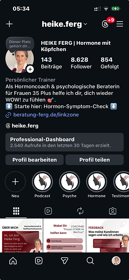 - Instagram-Follower 8.628 | 2540 Aufrufe in den letzten 30 Tagen | 378 Interaktionen – das ergibt eine Engagement-Rate von ca. 14,9% (378/2540), was für Gesundheits- und Wellness-Inhalte ausgezeichnet ist – weit über dem Branchendurchschnitt von 1-5% 😃.